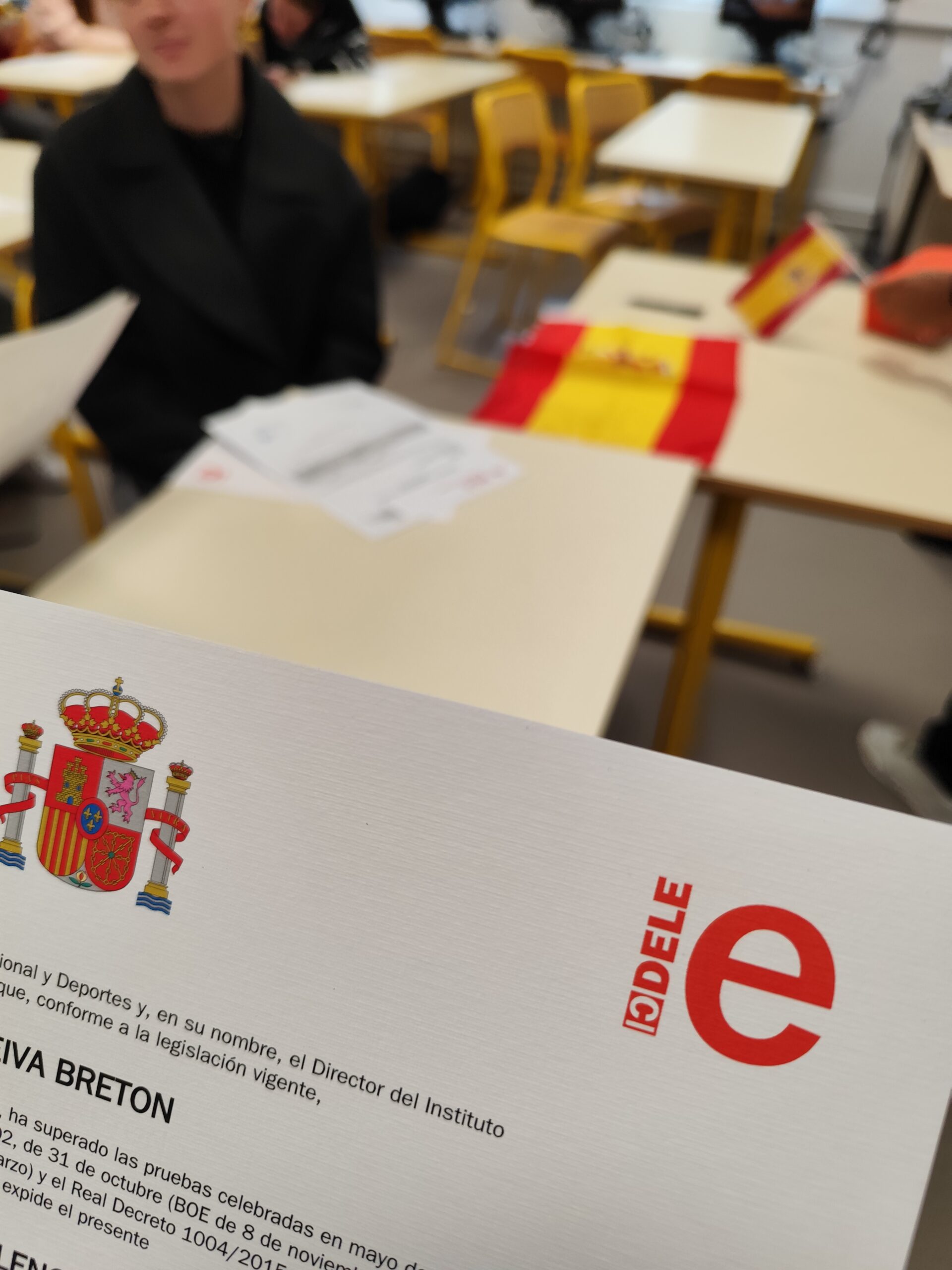 La Certification DELE-F, internationalement reconnue, est délivrée par « El Instituto Cervantes de Madrid ». Pour les élèves c’est un atout indéniable pour la poursuite de leurs études et une satisfaction personnelle qui couronne les efforts réalisés !