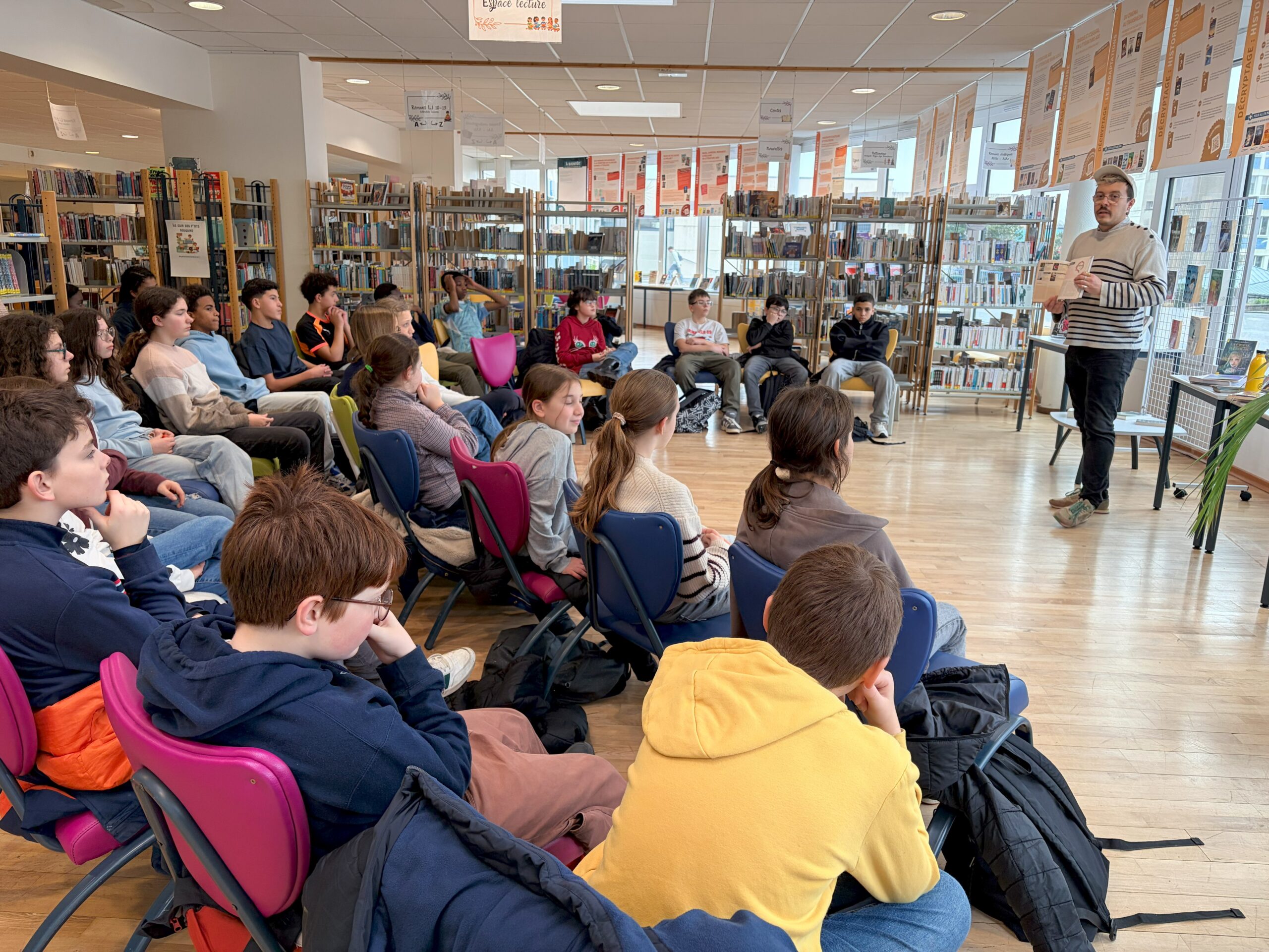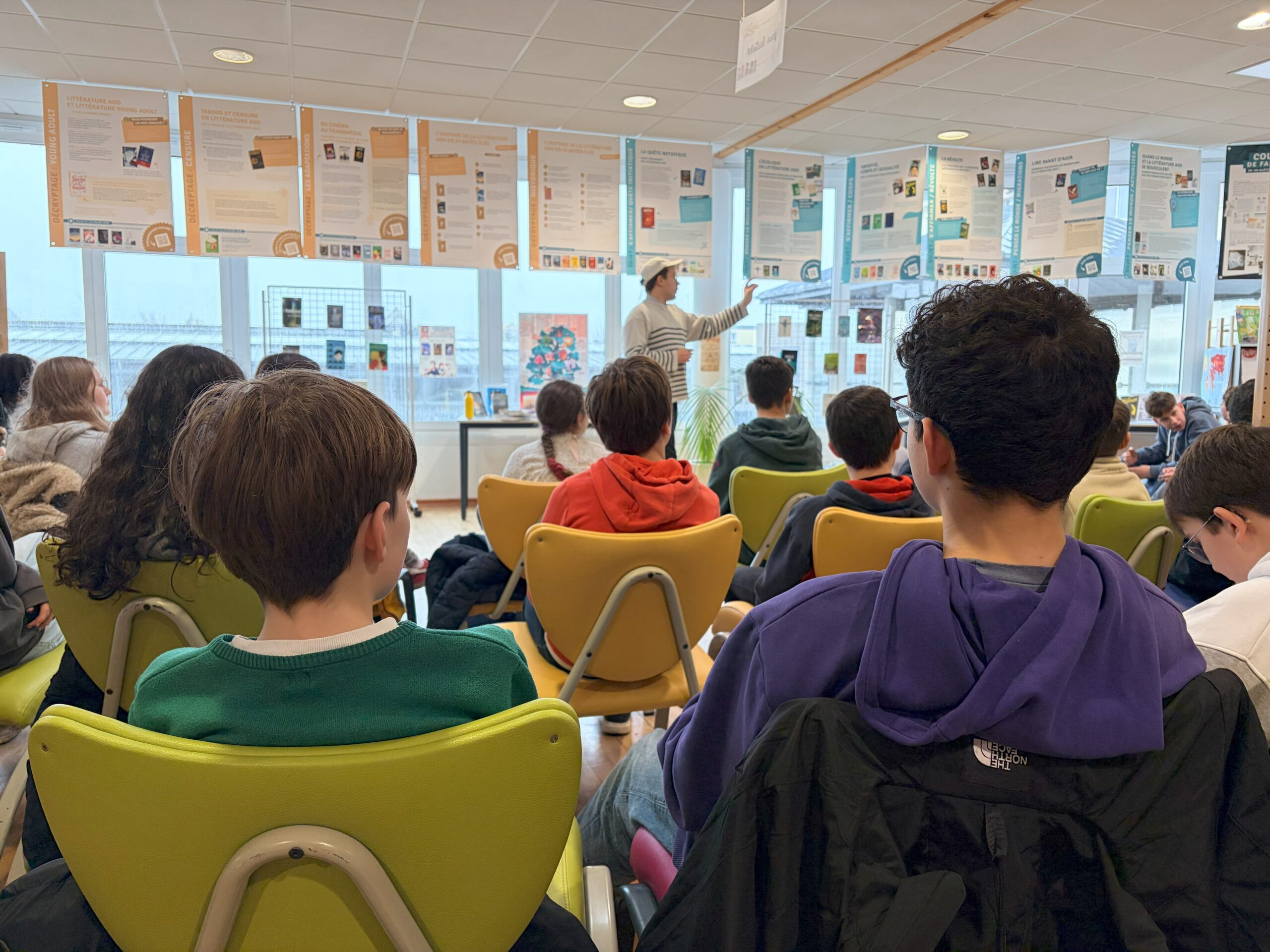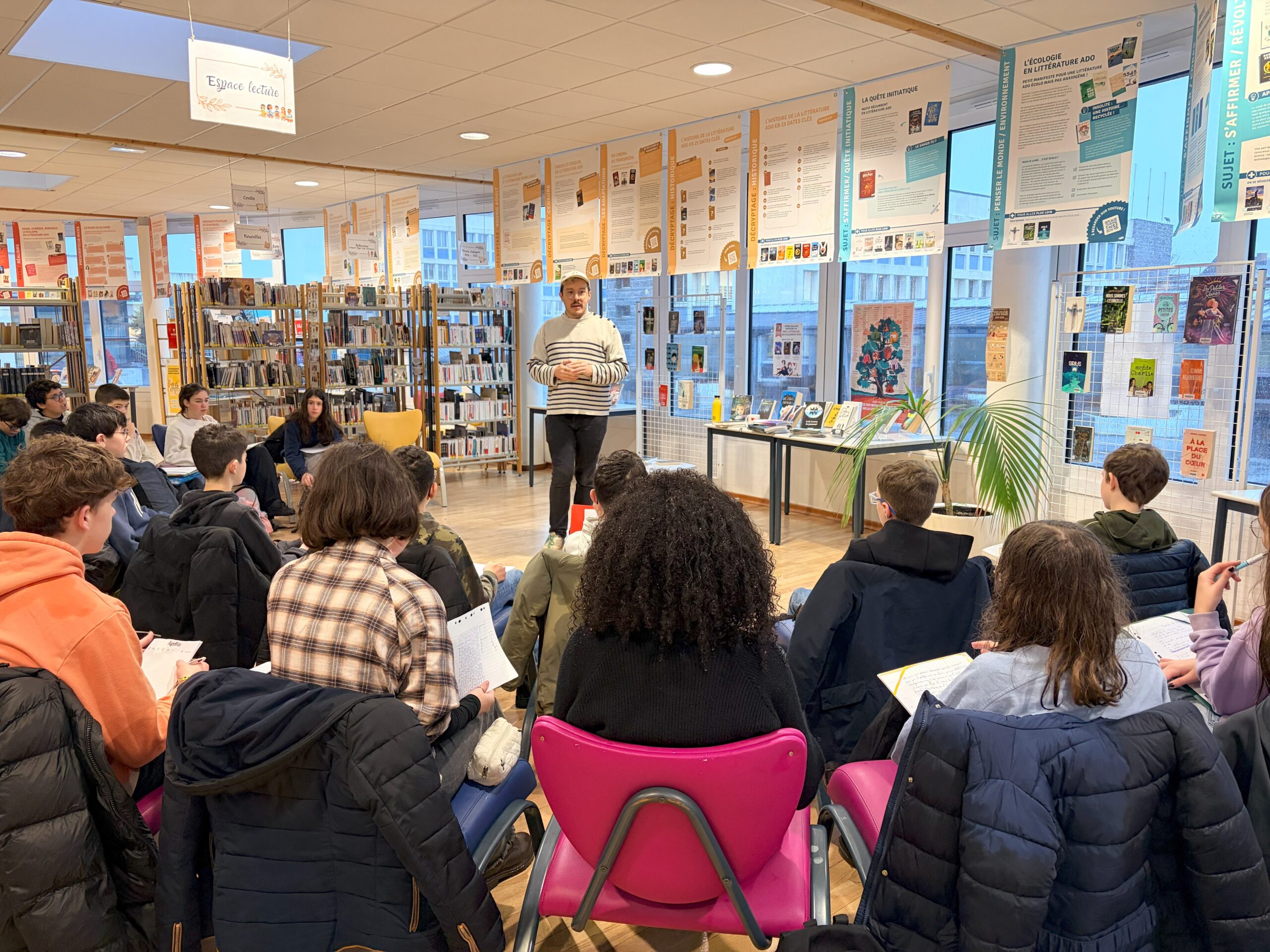 Ce mardi 10 février, les classe de 5e1, 5e2 et 5e5 ont eu la chance de rencontrer Tom Lévêque au CDI du collège dans le cadre du Prix Littéraire des collégiens. Spécialisé dans la littérature jeunesse, ce jeune auteur a su capter l’attention des élèves en utilisant l’exposition, dont il est co-créateur avec son frère Nathan Lévêque, actuellement installée au CDI et intitulée “Sur les chemins de la littérature ado !”. Cette dernière analyse la littérature jeunesse sous différents angles et propose les 100 romans incontournables dédiés aux adolescents. Chaque classe a ainsi pu poser mille et une questions autour de l’écriture, des thématiques abordées dans les romans jeunesses, des émotions que l’on peut ressentir en lisant ce genre d’ouvrages, etc. Un échange riche conclu par une séance de dédicaces sur des marque-pages offerts par l’auteur à nos élèves ravis.